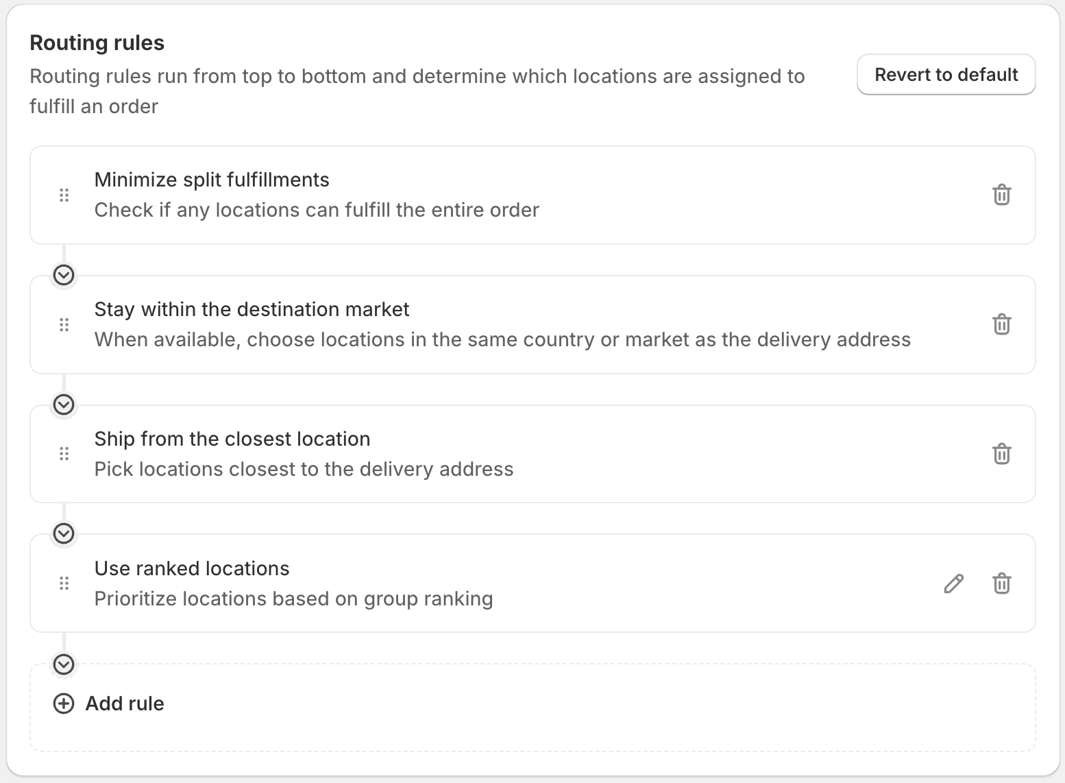 The screenshot below shows the different routing rule options in Shopify. The first three rules are the default routing setup: