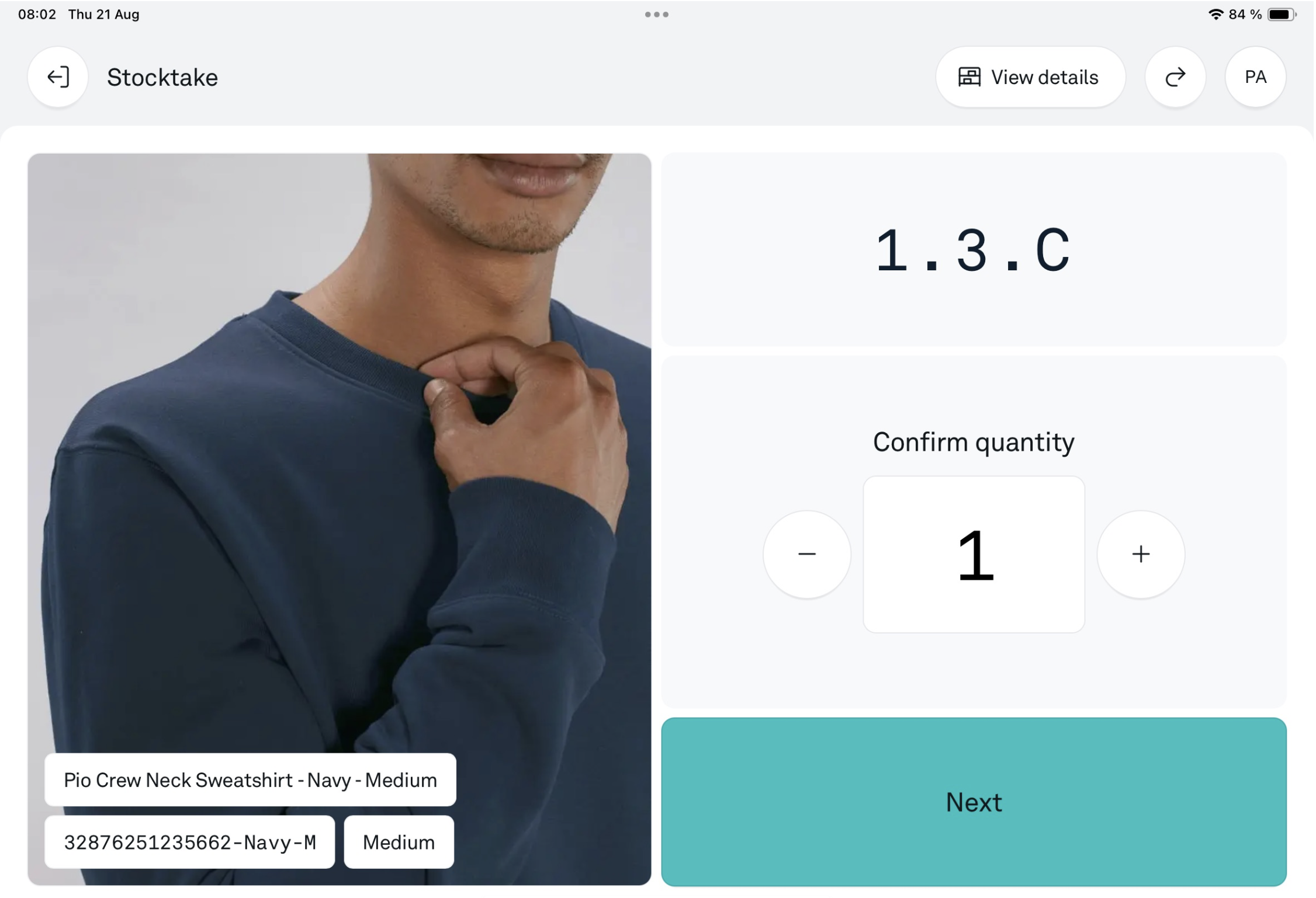 Count the products on the given location in the Pio app, and enter the quantity. You can count the items by using a hand scanner (scan each item to count), by using the +/- buttons on the screen, or by simply entering the number directly on the screen.