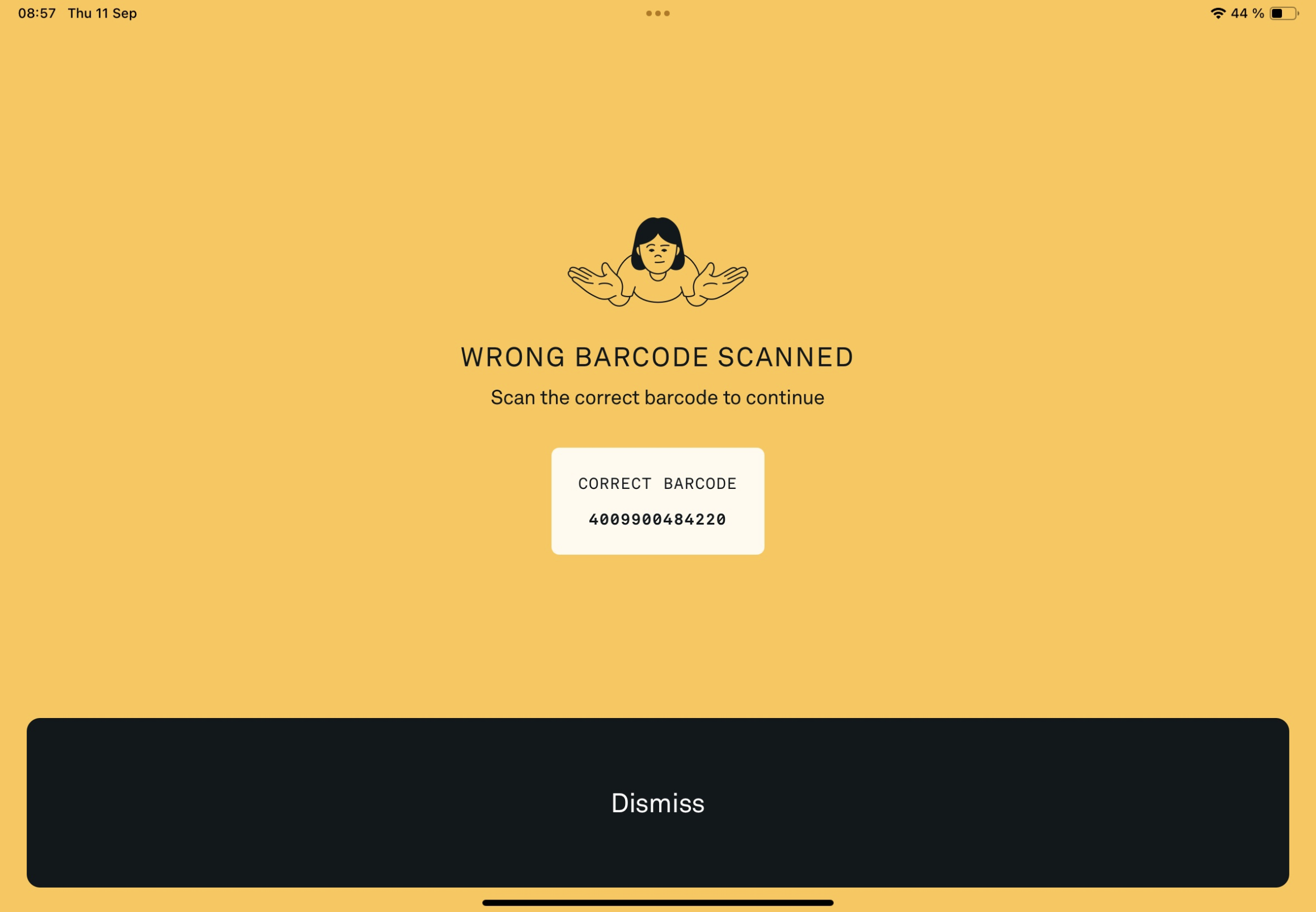 The background color is changed from red to yellow for the scanning error screen. The expected barcode is shown on the screen. When the scanned barcode matches the expected barcode, the error message is dismissed automatically. No need to press the 'Dismiss' button on the screen to continue.