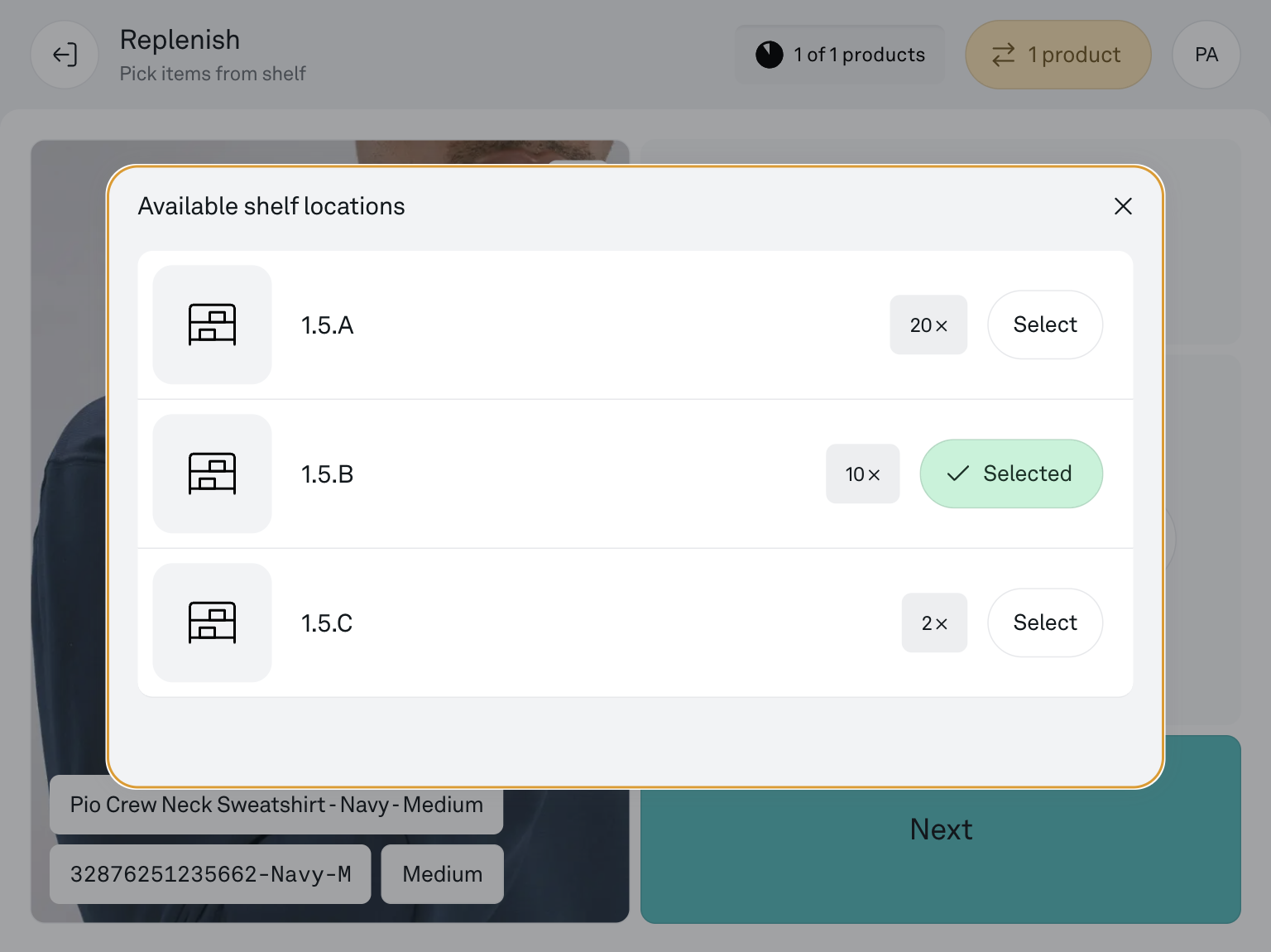 If a product is stored on multiple shelf locations, you can select the preferred location to pick from. Only shelves with sufficient inventory are available to select from: