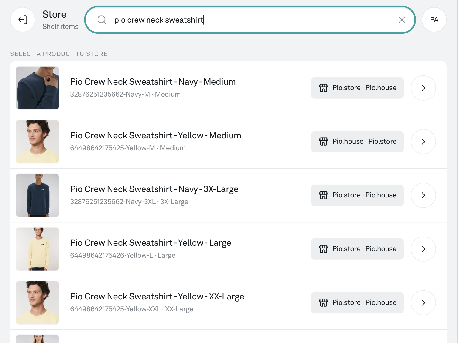 When multiple stores are connected to the same Pio organization, and some of the SKUs a shared, a label will inform you which store they belong to when storing.
