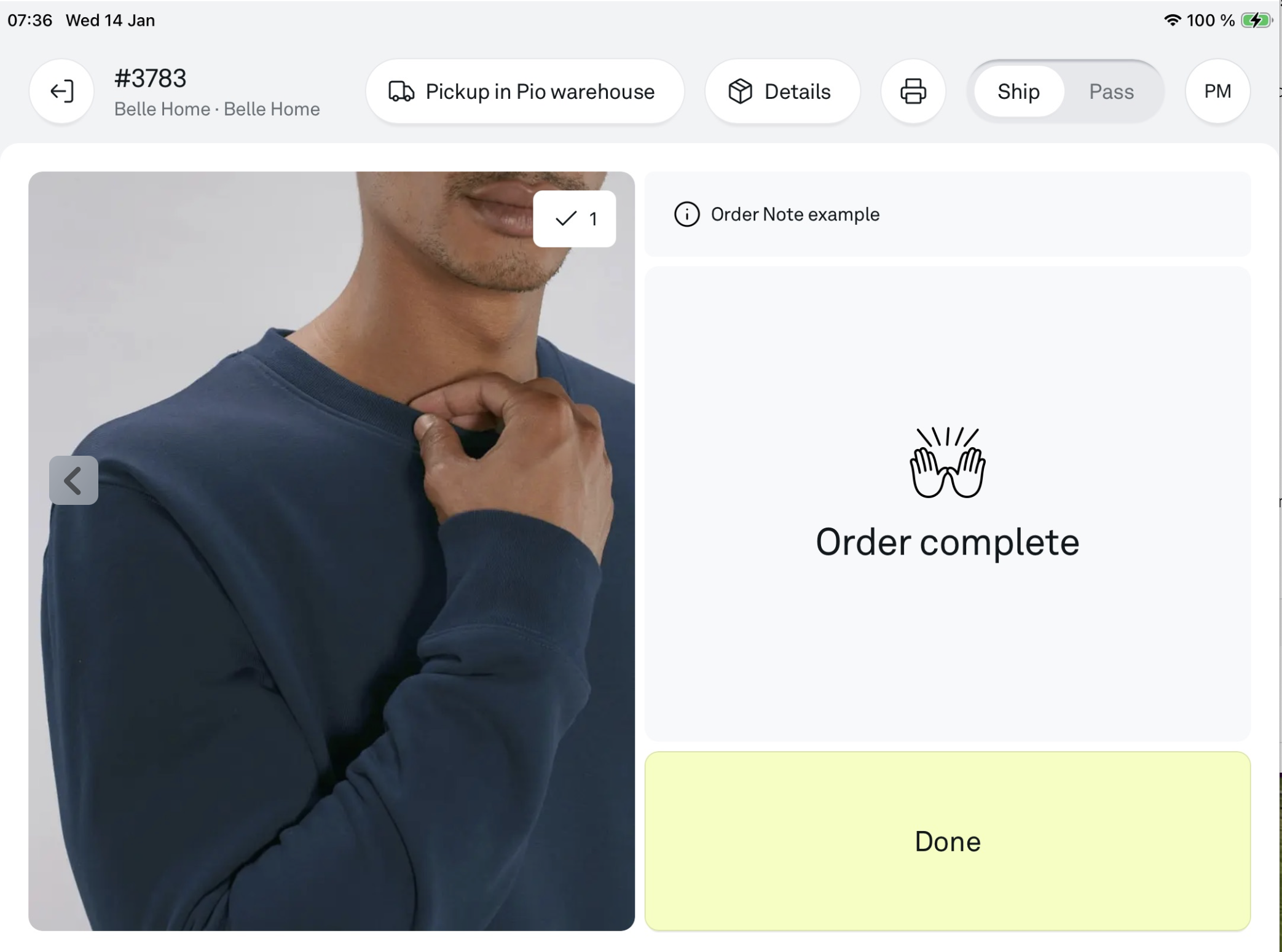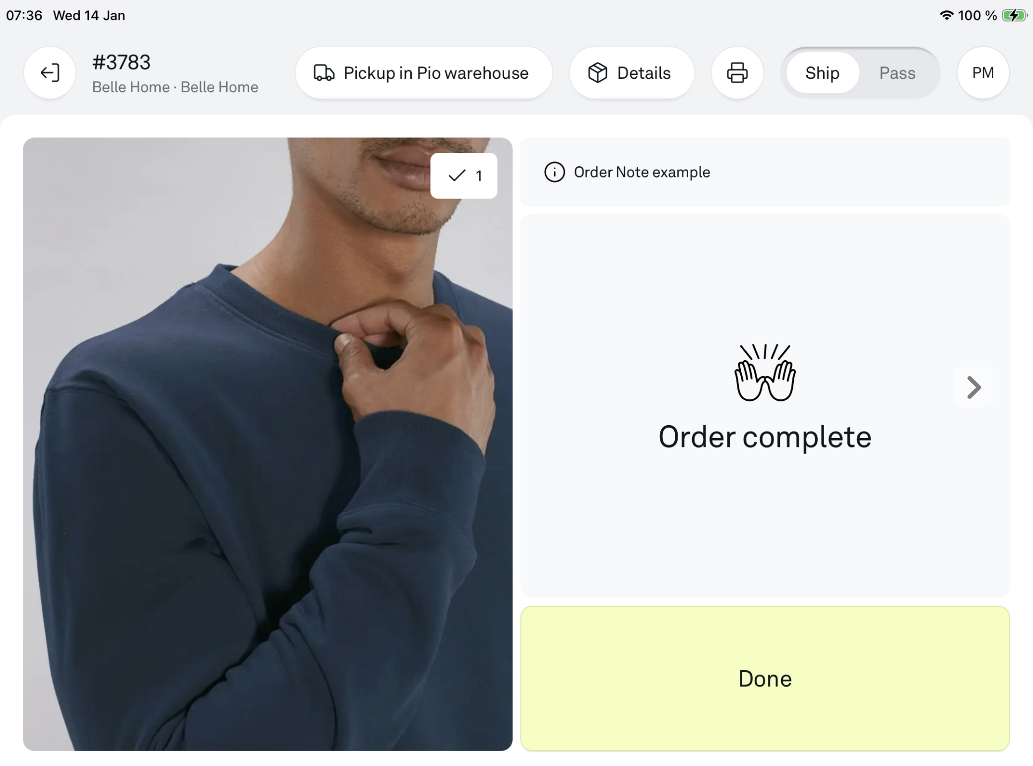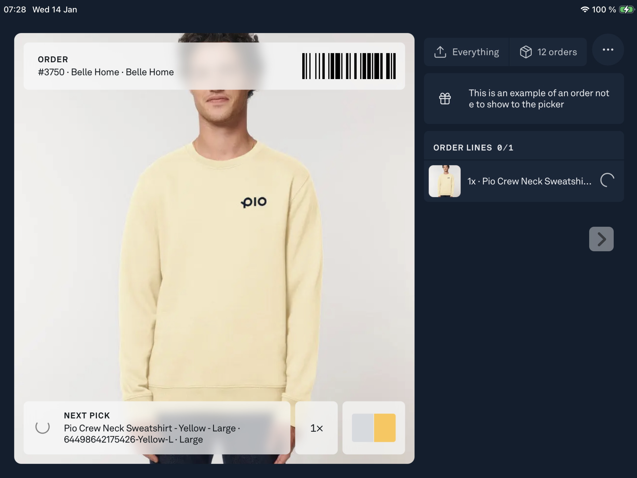 To pick the product, retrieve it from the physical shelf, click on 'Next pick' or 'Complete order', and you can proceed with the picking process in Pio as if you had just picked it from a regular bin.