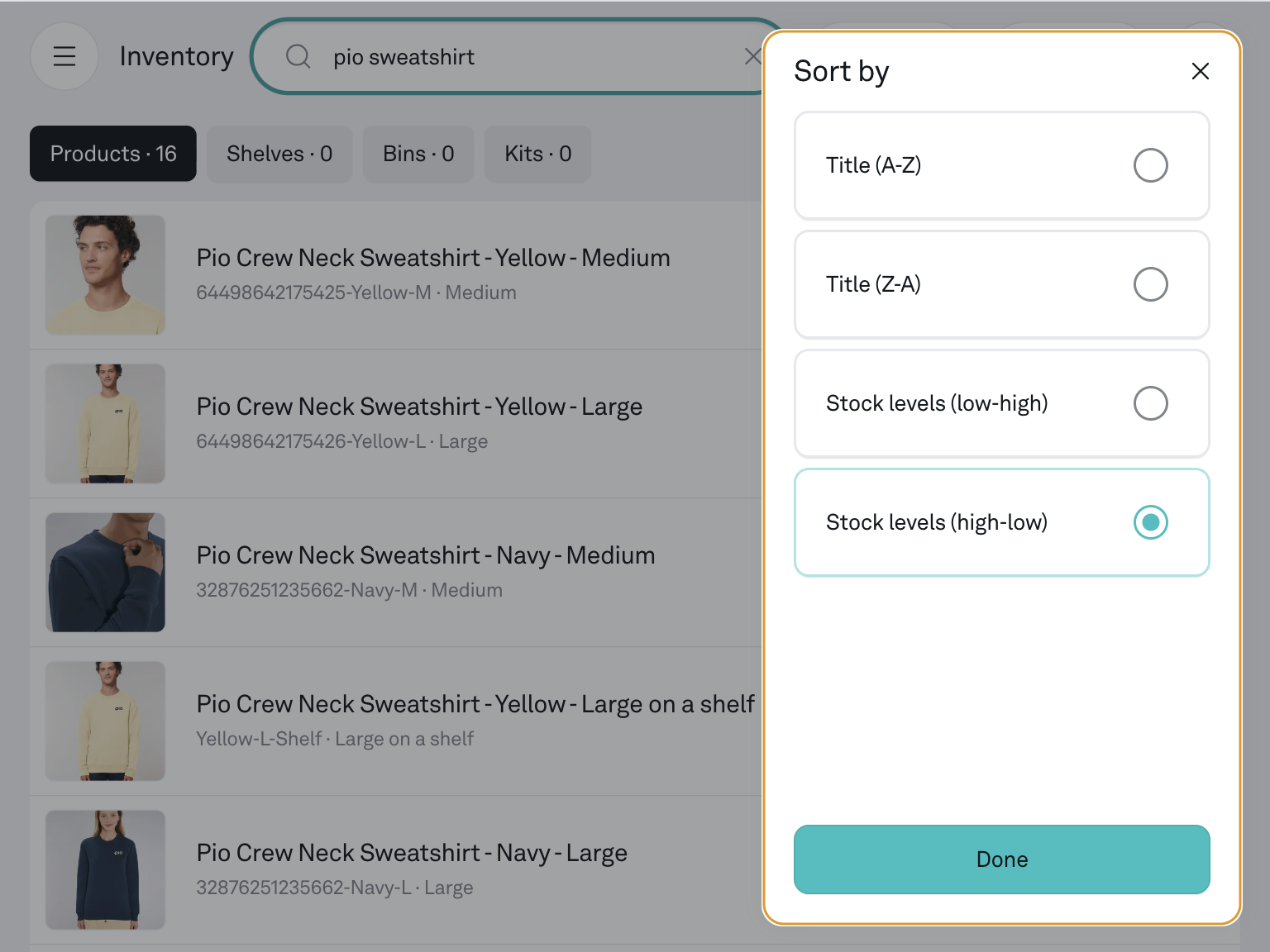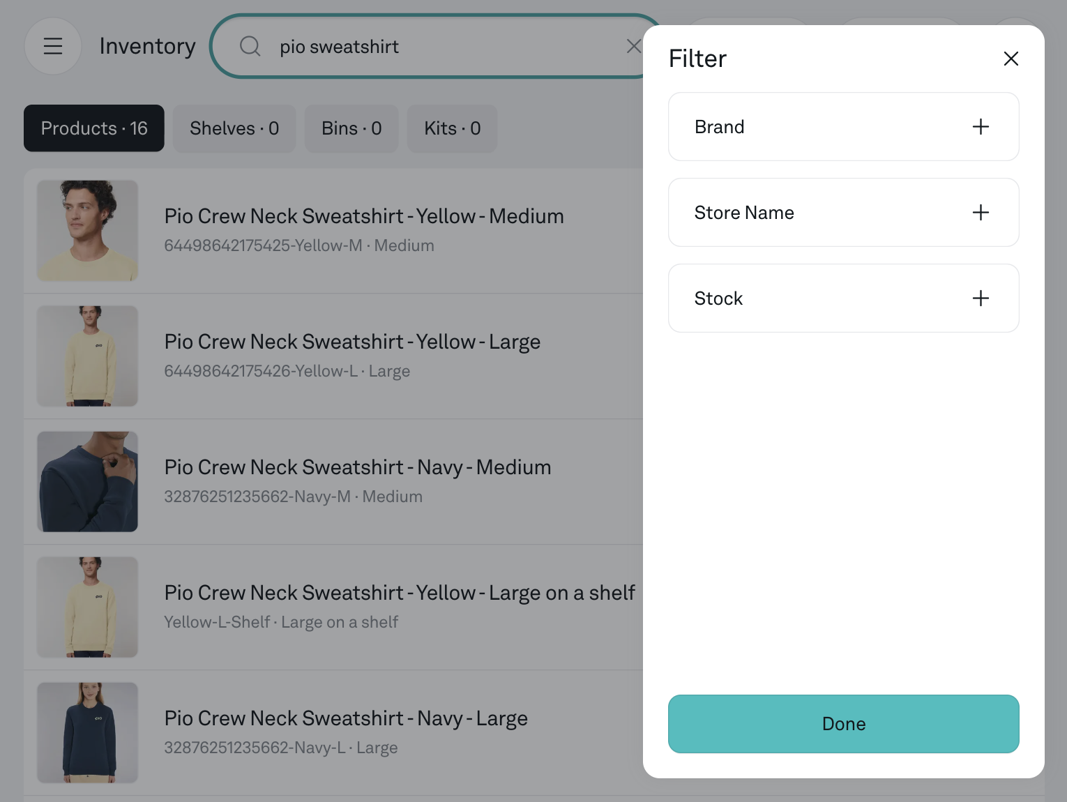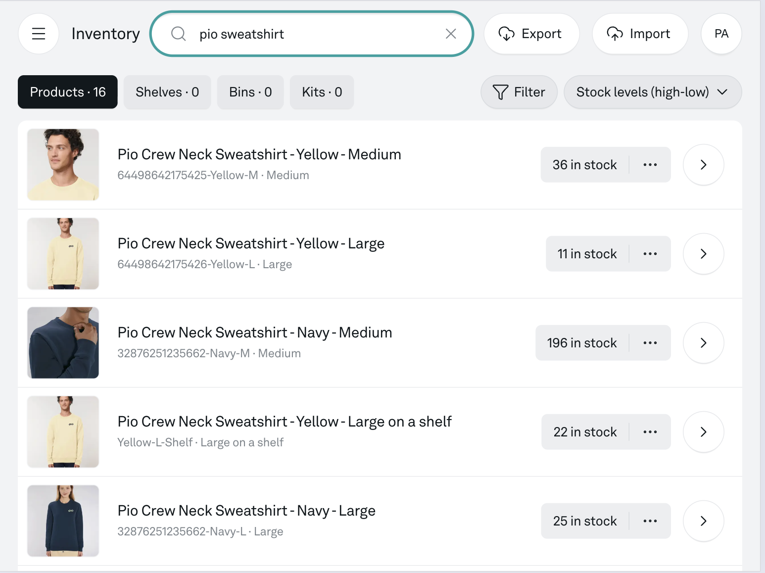 Pio Admins and Pio Managers will find the overview of all the products, shelf items, bins and kits in Pio system in Dashboard > Inventory.