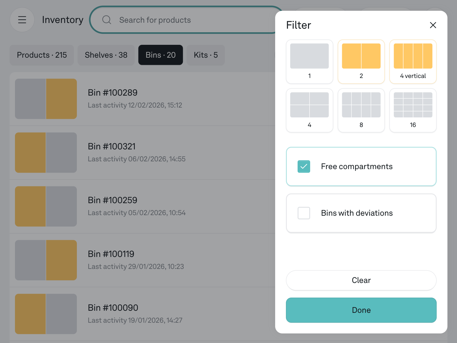 By using filters, you can limit the list of bins by the number of compartments (1, 2, 4, 4(verticals), 8, 16) or to see all empty compartments.